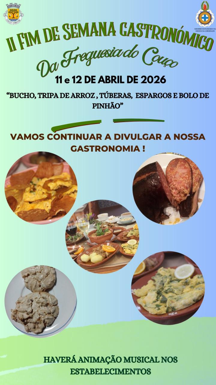 A Junta de Freguesia promove o II Fim de Semana Gastronómico da Freguesia do Couço, nos dias 11 e 12 de abril de 2026.